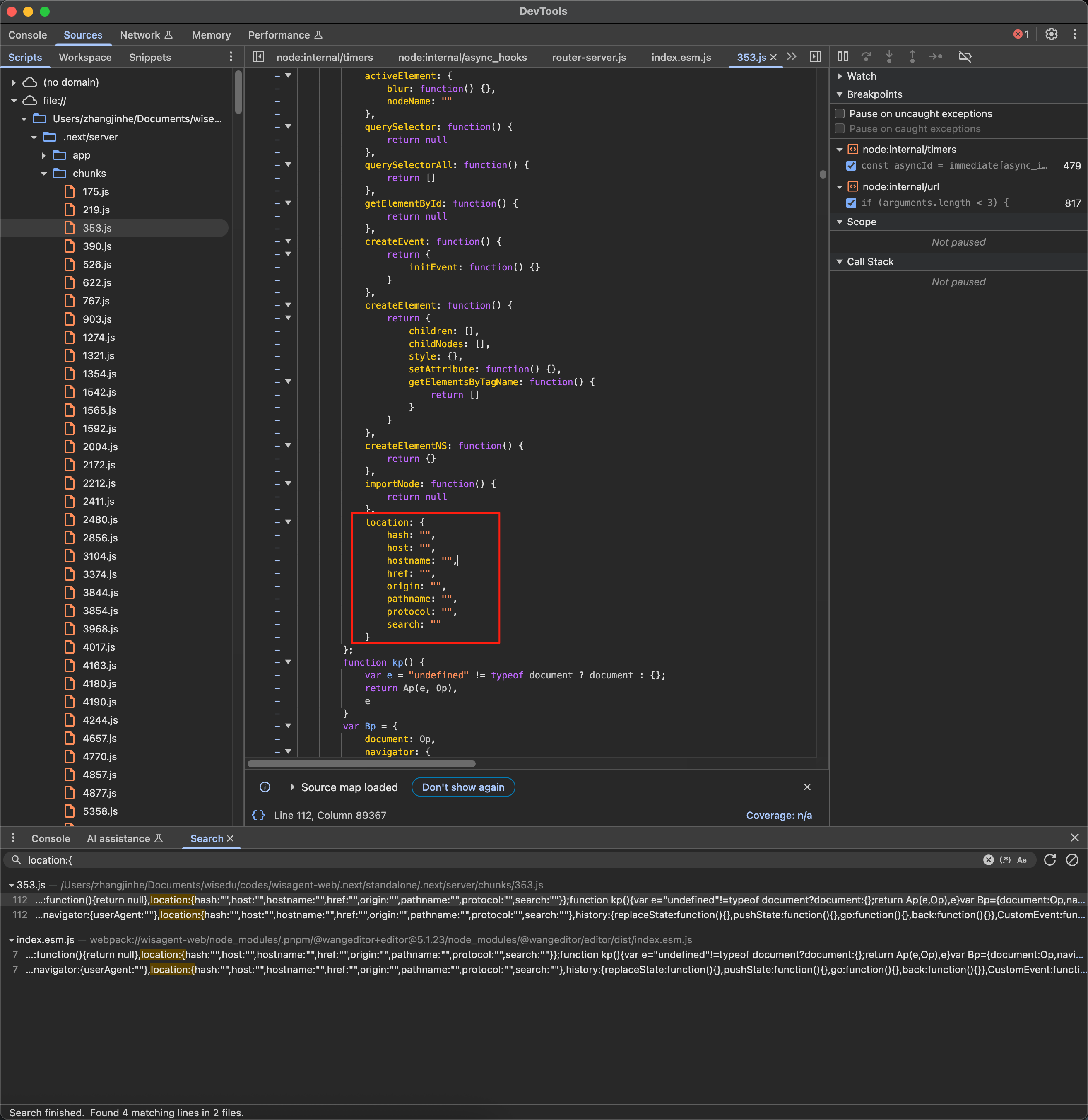 通过检查编译后的代码,我们发现了一个重要线索 —— 在 Node.js v22 环境下,location 对象的值与 wangEditor 的 node-polyfill.ts 中定义的不同: